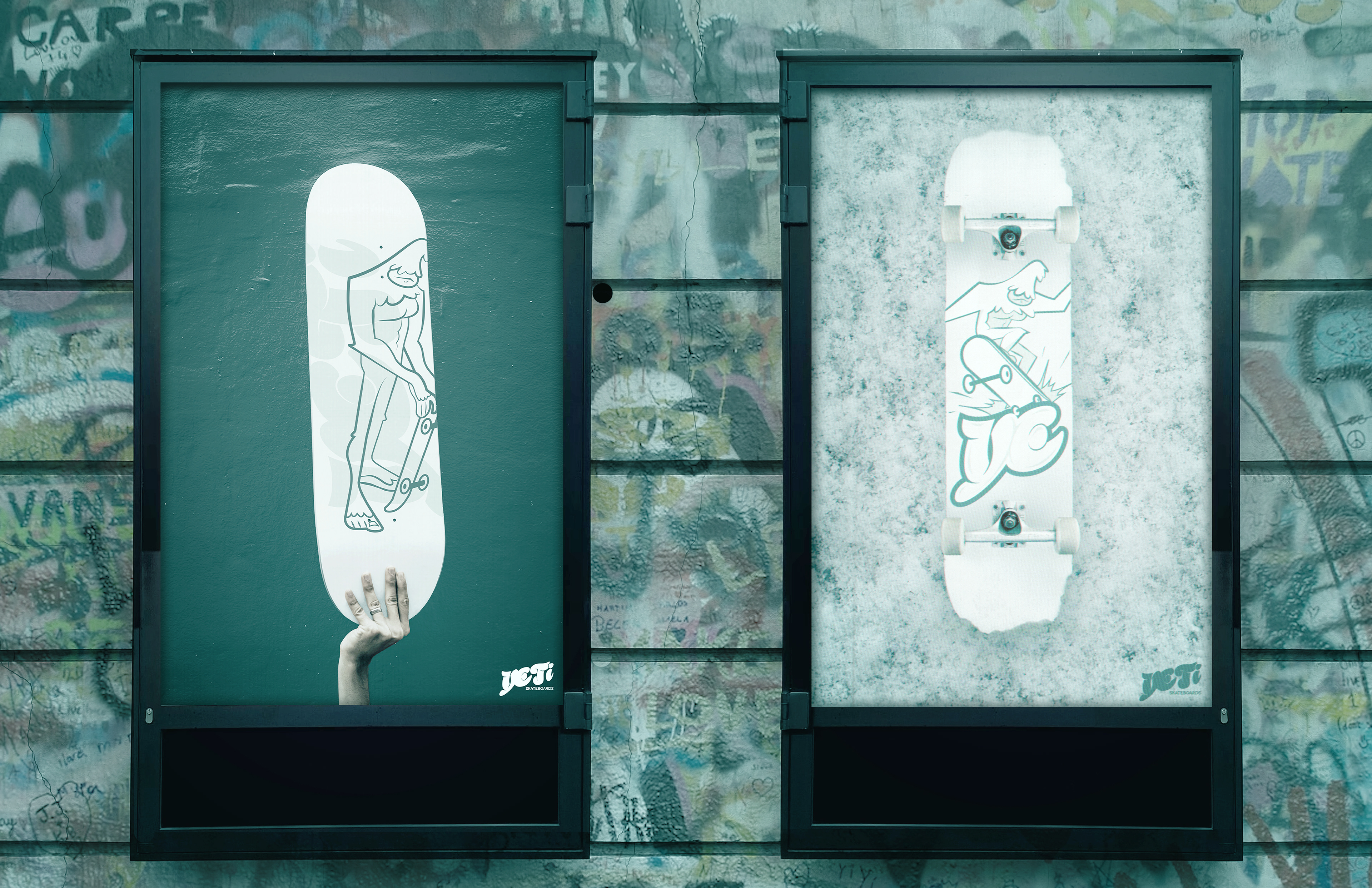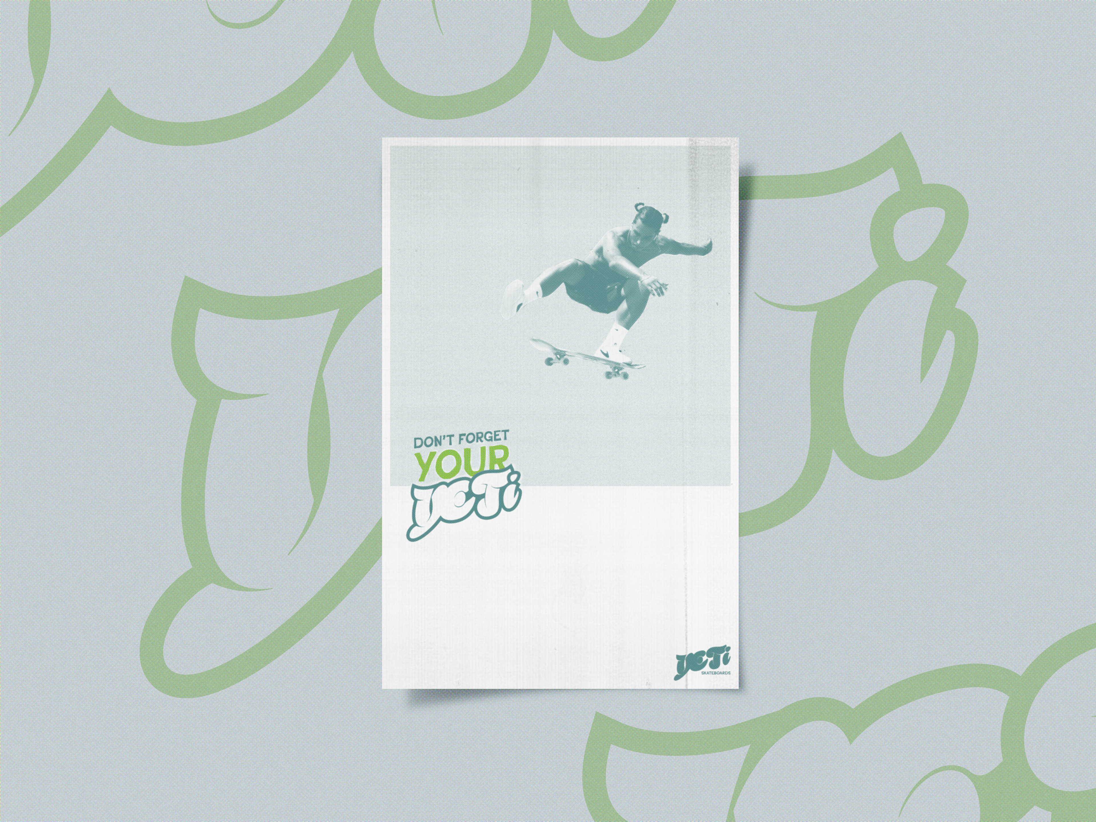 I designed the brand identity for a skateboard brand called Yeti Skateboards. This includes logo variations, brand colors, typography, product design, and social media content. I also developed and illustrated a mascot character to represent the brand. The designs are featured on products such as skateboards, t-shirts, and posters.